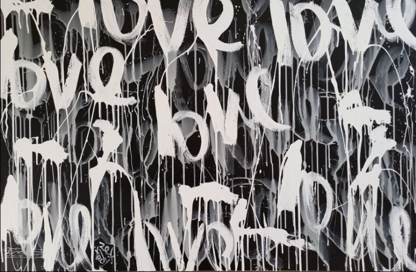ALLES FÜR IMMER ABBRACCIARSI, Modernes Malfeld mit nebel-, Tinte-, Spray-, Acryl- und Markertechnik, 100 x 80 cm, 2020