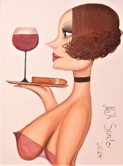 Madame Cohiba als Kellnerin mit Wein und Zigarre, Öl auf Papier, 30 x 40 cm, 2024