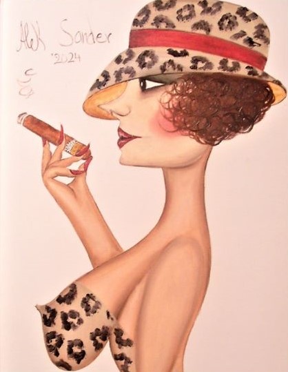 Madame Cohiba im Leopardenlook mit Zigarre, Öl auf Papier, 30 x 40 cm, 2024