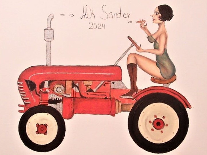 Madame Cohiba mit einem Porsche Traktor Bulldog mit Zigarre, Öl auf Papier, 30 x 40 cm, 2024