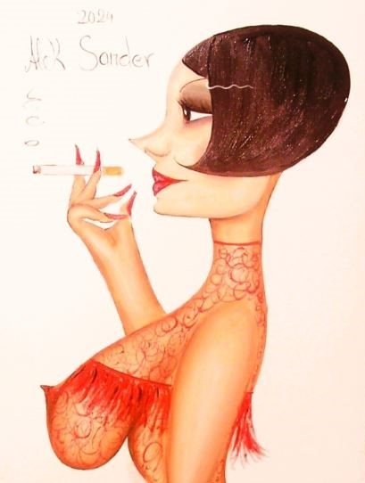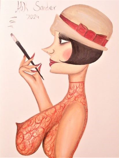 Madame Cohiba mit einer Zigarette in der Hand, Öl auf Papier, 30 x 40 cm, 2024