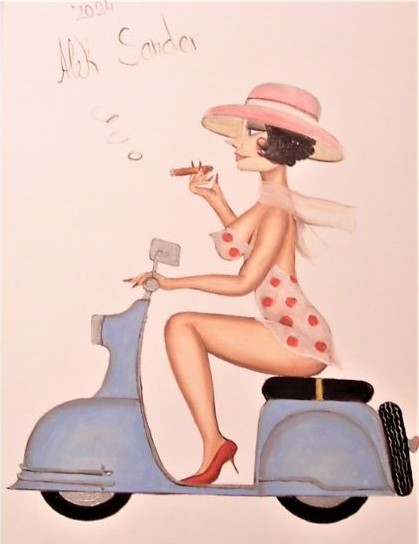Madame Cohiba auf einem GoGo Roller mit Zigarre, Öl auf Papier, 30 x 40 cm, 2024